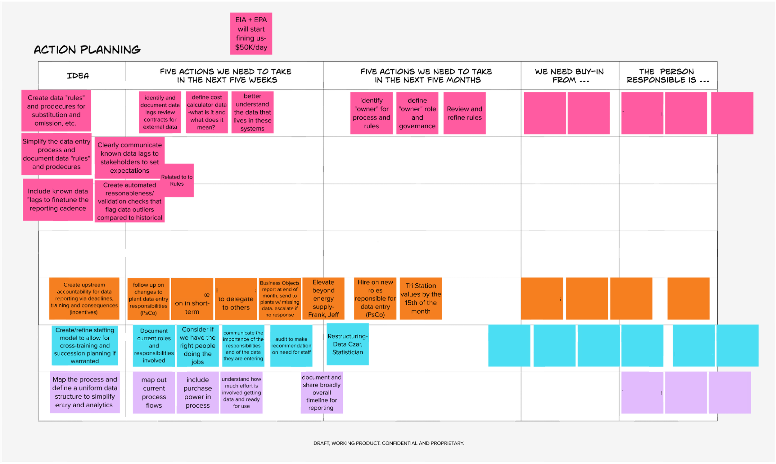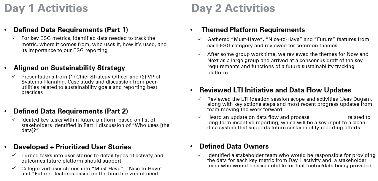 With a new lens on sustainability tracking - which included Environmental, Social and Governance metrics - my colleague and I designed a 2-day, in-person, requirements gathering session. The attendees included employees from across the enterprise including our corporate strategy office, energy plant operations (transmission), human resources and investor relations.