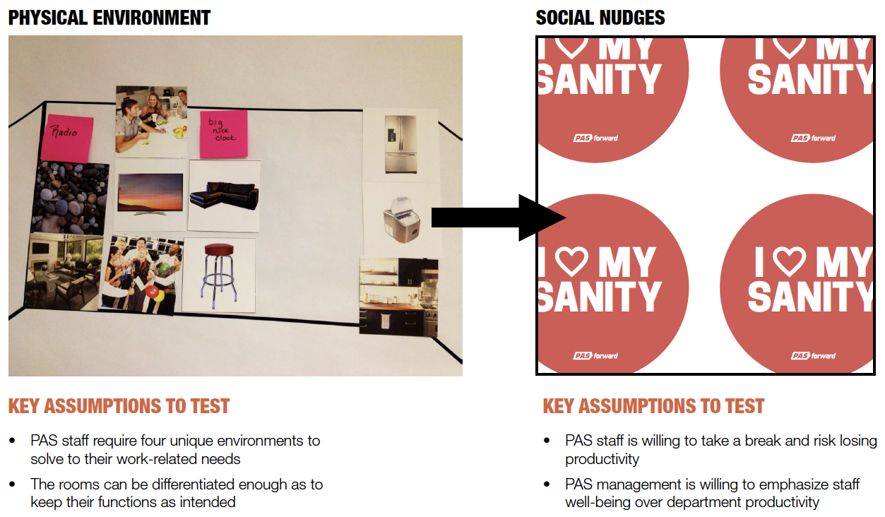 Coming out of an earlier phase of ethnographic research, the project focused on two of eight opportunity areas: (1) realign roles and responsibilities to support department needs and (2) explore space and technology options that improve well-being. The 12-week project included exploratory research, concept development, prototyping & testing, and recommendations.